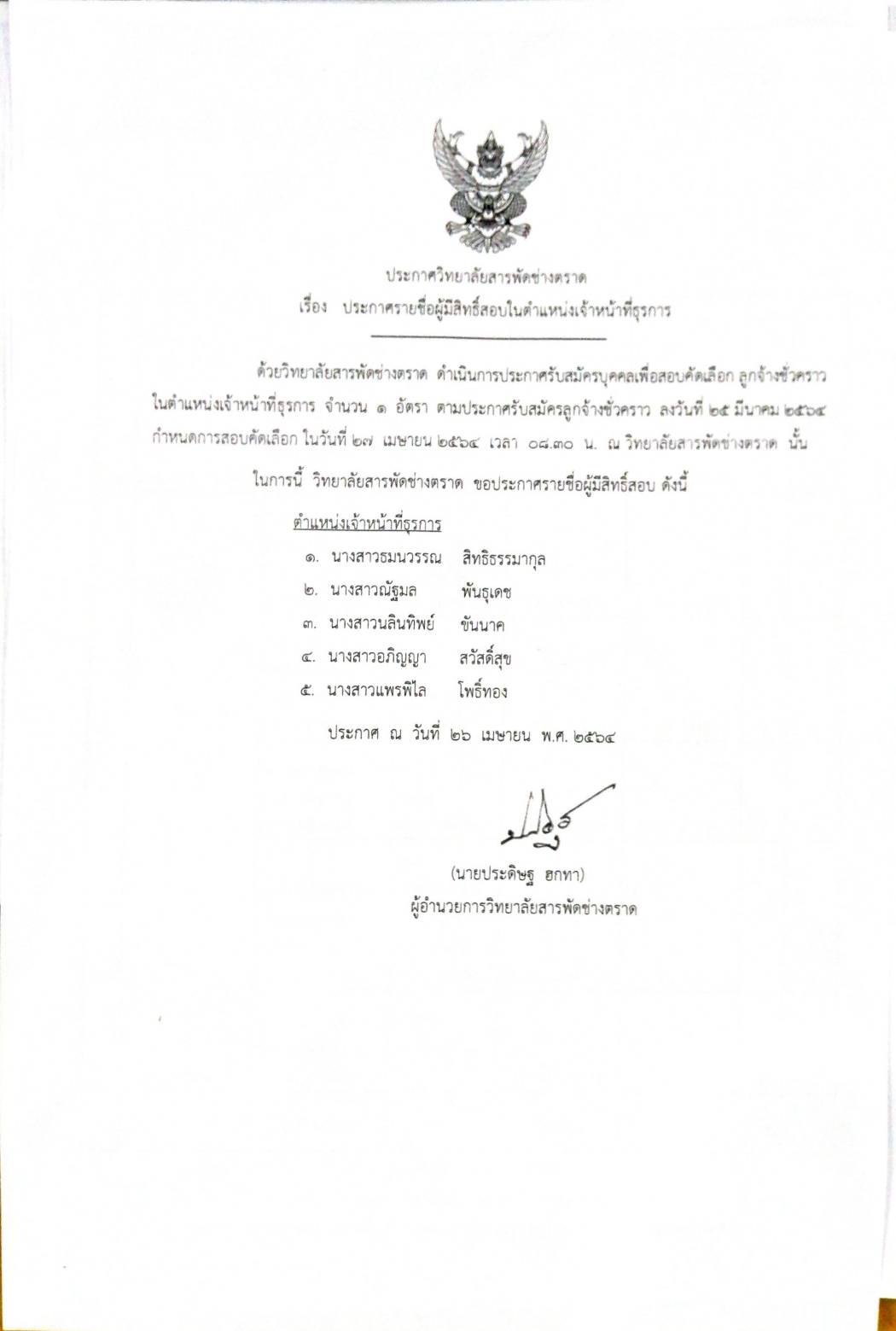 ประกาศวิทยาลัยสารพัดช่างตราด เรื่อง ประกาศชื่อผู้มีสิทธิ์สอบในตำเหน่งเจ้าหน้าที่ธุรการ